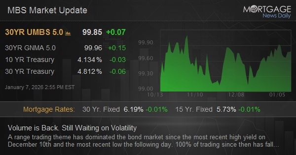 A range trading theme has dominated the bond market since the most recent high yield on December 10th and the most recent low the following day. 100% of trading since then has fallen inside those boundaries (4.10-4.20% in terms of 10yr yields). Even though volume has made a resounding post-holiday return, there's little for market watchers to do until we see a breakout. Wednesday and Friday's econ data continue to be the best bets as far as catalysts go.