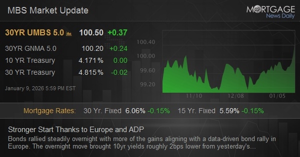 Bonds rallied steadily overnight with more of the gains aligning with a data-driven bond rally in Europe. The overnight move brought 10yr yields roughly 2bps lower from yesterday's close. Another 2bps of improvement followed this morning's ADP employment data. ADP's job count wasn't particularly far below forecasts (41k vs 47k), but the previous month wasn't revised much higher (-29k vs -32k initially). At 10am ET, we'll get Job Openings and ISM Non-Manufacturing--a combo that is arguably heavier hitting than ADP, if the results are not right in line with forecasts.