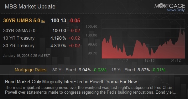 The most important-sounding news over the weekend was last night's subpoena of Fed Chair Powell over statements made to congress regarding the Fed's building renovations. Bond yields were slightly higher this morning and commentators erroneously connected those dots. There was actually no meaningful movement in either direction when the news hit, but trading volume confirms the news was noticed.