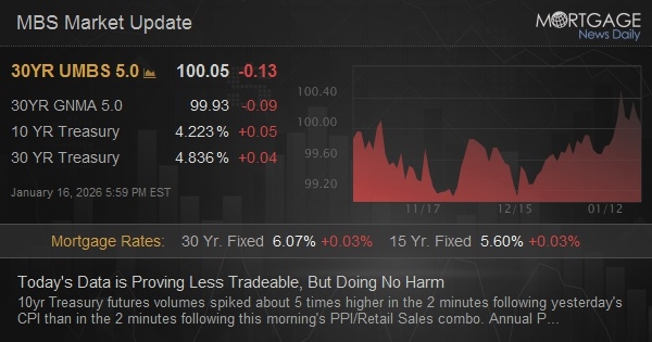 10yr Treasury futures volumes spiked about 5 times higher in the 2 minutes following yesterday's CPI than in the 2 minutes following this morning's PPI/Retail Sales combo. Annual PPI was the highest since July with headline and core both at 3.0%. But November's results were lower than expected (core m/m at 0.0 vs 0.2). It was a big upward revision to September that caused the uptick in the annual number. Retail sales came out a bit stronger at the headline level, but the core was as-expected and the previous month's core was revised down 0.2%. All told, there's no obviously bad news for bonds here and yields are unchanged to slightly lower so far.