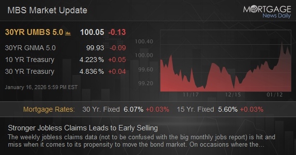 The weekly jobless claims data (not to be confused with the big monthly jobs report) is hit and miss when it comes to its propensity to move the bond market. On occasions where the results fall far from the forecast, we tend to see moderate reactions. Odds increase when the headline breaks under the psychological level of 200k. With that, today's 198k print is having a bit of a negative impact on bonds at 8:30am, taking the market from roughly unchanged overnight levels into slightly weaker territory. A stronger Philly Fed index offered no solace.