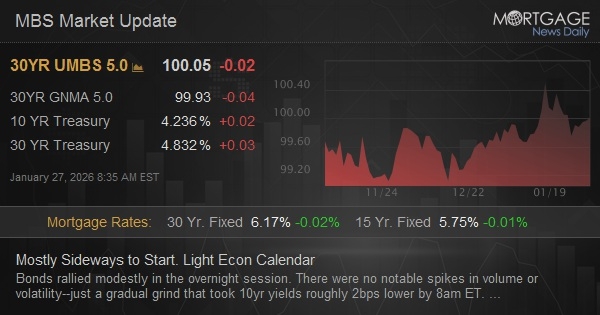 Bonds rallied modestly in the overnight session. There were no notable spikes in volume or volatility--just a gradual grind that took 10yr yields roughly 2bps lower by 8am ET. Volume picked up at the 8:20am CME open (as it usually does) and this time it brought more sellers. The net effect is a return to unchanged levels, for the most part. There's some data on deck with S&P PMIs, Consumer Sentiment, and Leading Indicators, but not of these are top tier market movers. The rest of the day's momentum is more likely to be dictated by pre-weekend position squaring unless there's an unexpected geopolitical development.