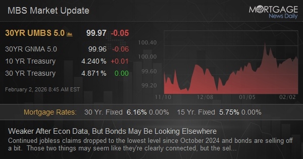 Continued jobless claims dropped to the lowest level since October 2024 and bonds are selling off a bit. Those two things may seem like they're clearly connected, but the selling didn't start for another 15 minutes after the data and the most noticeable selling has taken place in the past 15 minutes (almost a full hour after the data). As for a scapegoat for that selling, there's only conjecture. We can see surging commodities prices coinciding with Treasury sales, but we wouldn't leap to the assumption that traders are selling bonds to buy commodities. In any event, the damage is fairly limited in the big picture. One could simply say this is an ongoing rejection of 10yr yields re-entering the previous trading range.