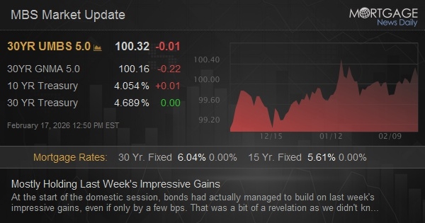 At the start of the domestic session, bonds had actually managed to build on last week's impressive gains, even if only by a few bps. That was a bit of a revelation as we didn't know how much credit to give "defensive positioning ahead of a 3 day weekend" for a portion of those gains. Now that we're a few hours into the trading day, the early gains have evaporated, but not in an overly-alarming way. Barring unexpected headlines, it looks like bonds will be able to digest the Wednesday's Fed minutes from well within the confines of a 4.0-4.10% range in 10yr yields.