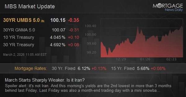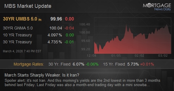 Spoiler alert: it's not Iran. And this morning's yields are the 2nd lowest in more than 3 months behind last Friday. Last Friday was also a month-end trading day with a mini snowball rally that defied overt explanation (apart from "month end bond buying")--a fact that led us to warn about the risk of "new month bond selling." It's not that bonds always rally at month-end or sell off when the new month begins, but if there's a sharp, inexplicable move on the last day of any given month, the risks of a reversal increase on the first day of the following month. Geopolitical headlines may cause modest volatility here and there, but bonds' correlation with oil prices is not a reliable analytical focus.