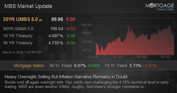 Bonds sold off again overnight with 10yr yields now challenging the 4.10% technical level in early trading. MBS are down another 3/8ths, roughly. And there's stronger correlation with higher oil prices and rising bond yields. So in light of our contrarian take yesterday, are we now forced to acquiesce to the "higher inflation/higher rates" narrative? Not entirely. While there's no doubt that a certain contingent of smaller traders are drawing that conclusion, and while there's better evidence for it in some of today's charts, there remains a problematic reality in an even simpler chart. There's a tradeable security that measures market-based inflation expectations and it has shown almost no uptick in the past 2 days.