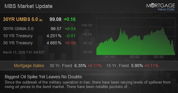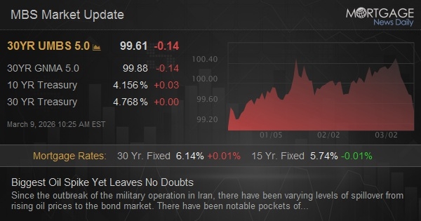 Since the outbreak of the military operation in Iran, there have been varying levels of spillover from rising oil prices to the bond market. There have been notable pockets of time where the correlation broke down, but when viewed in less granular detail, oil prices and bond yields have moved higher together over the past week. Now this morning, there's a new mega-surge in oil (presumably due to Iran's leadership announcement and its implications for more military escalation) and the correlation is undeniable when viewed over a short time period. Today's first chart shows there's no question of that short-term correlation.