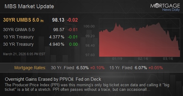 The Producer Price Index (PPI) was this morning's only big ticket econ data and calling it "big ticket" is a bit of a stretch. PPI often passes without a trace, but can occasionally get an obvious response even if it's not a huge response. Today's installment is bigger than normal. If there's a reason, it would be that the PPI components that flow through to PCE (a more important inflation metric) are all elevated (sometimes they run counter to the PPI headline). If there's another reason, it's because bonds aren't just reacting to PPI but also doing the same oil "follow oil prices" routine. The Fed announcement and dot plot hits at 2pm.