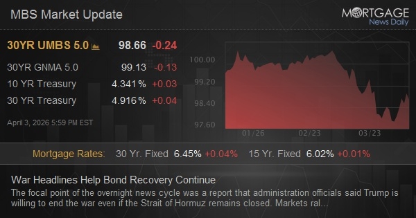 The focal point of the overnight news cycle was a report that administration officials said Trump is willing to end the war even if the Strait of Hormuz remains closed. Markets rallied nearly as much just before the open when Trump said the hard part is essentially done on the Iran war (and that other countries should just go take their own oil now, or buy it from the U.S.). The initial move took yields from 4.36 to 4.33 and the pre-open rally was 4.34 to 4.30--"moderate," but notable as it is happening on the day after an already big rally. War headlines remain in focus despite econ data ramping up. If 10am ET job openings data is spicy enough, it could command some attention given that the "recession fear" trade is thought to be the key reason that bond yields defied higher oil prices yesterday.
