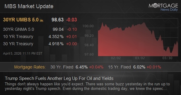 Things don't always happen like you'd expect. There was some buzz yesterday in the run up to yesterday night's Trump speech. Even during the domestic trading day, we knew the speech would offer some touting of accomplishments and a reiteration that objectives were "nearly complete." Both of those things happened, but the speech also promised forceful escalation under certain circumstances. While that's nothing new, it wasn't what the market was hoping to hear last night. As a result, oil prices and bond yields spiked and stocks sold symmetrically. Bonds are juggling the dueling narratives of inflation and economic fallout--a fact that has helped them avoid tighter correlation with the oil price spike.