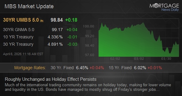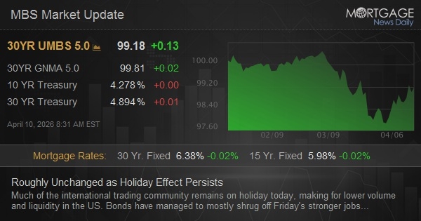 Much of the international trading community remains on holiday today, making for lower volume and liquidity in the US. Bonds have managed to mostly shrug off Friday's stronger jobs report--a fact that we'd attribute mainly to the focus on the unemployment rate over the balmy payroll count. Additionally, war-related developments remain near the top of the heap of relevant market movers until their impacts translate more forcefully to economic data. On that note, we'll get ISM Services data this morning and CPI on Friday--both for the month of March. The weekend offered no meaningful changes in the status of the war other than the notion of a 45 day ceasefire being floated, but not yet approved by either side.