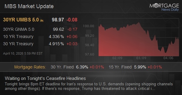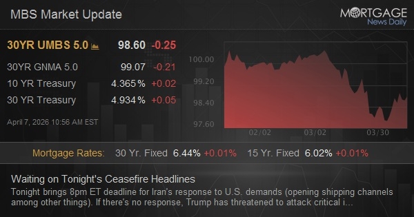Tonight brings 8pm ET deadline for Iran's response to U.S. demands (opening shipping channels among other things). If there's no response, Trump has threatened to attack critical infrastructure like bridges, power plants, etc.--a major escalation that would all but guarantee a much longer run of high oil prices (and all that goes with it). Reports of progress in peace talks (or lack thereof) are all over the map depending on who's reporting and when. If there's a genuine de-escalation (which could be announced hours before the deadline), you'll know it based on the market response. If it happens after the close, futures/forex markets would still provide evidence of the market's reaction. Between now and then, it's just a waiting game with no clear direction.