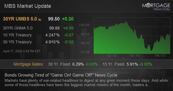 Markets have plenty of war-related headlines to digest at any given moment these days. And while some of those headlines have been the biggest market movers of the month, traders are increasingly focusing on the examples that speak to the biggest-picture changes. Specifically, markets aren't as interested in Wayne and Garth saying "game on" and "game off," but rather, the actual moment that they pack up their sticks and nets and stop playing street hockey for the day (i.e. an announcement that the war is fully over and Hormuz is fully re-opened). In the meantime, the lesser headlines may add some slight 2-way volatility, but there are no obvious examples of that so far today (despite hundreds of potential opportunities). Bonds are taking the morning to consolidate the past 2 days of gains with a modest pull-back against a backdrop void of high consequence econ data.