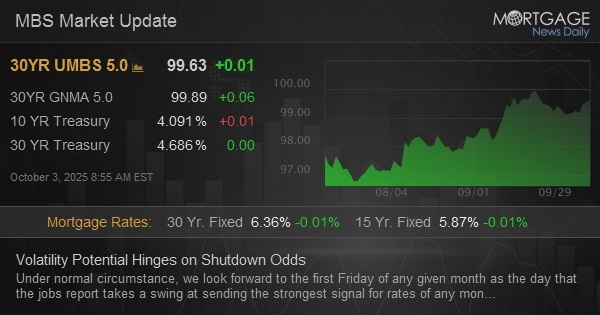 Under normal circumstance, we look forward to the first Friday of any given month as the day that the jobs report takes a swing at sending the strongest signal for rates of any monthly economic report. This Friday will be no different IF we actually get the jobs report. If, on the other hand, a government shutdown is announced on Wednesday, the jobs report will be delayed and markets will be forced to wait at least several days before a delayed release. There's a notion floating around that the market will simply shift its pent up jobs report reaction to the ADP data that comes out on Wednesday, but in our experience, ADP would still be traded like ADP.  In other words, it would have to come in much higher or lower in order to garner a big reaction. As the week begins, bonds are moderately stronger and traders are focused on an afternoon meeting between Trump and congressional leaders. Hopes are not high for averting a shutdown, but  in any event, the odds will become more clear as newswires circulate circulate.