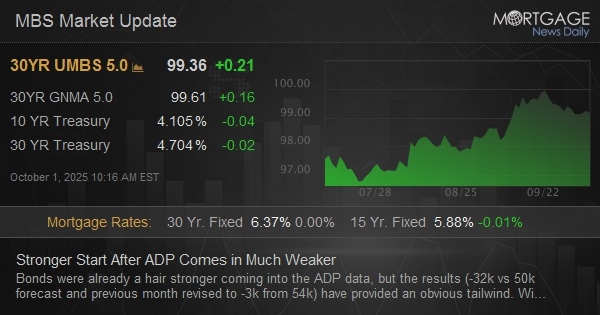 Bonds were already a hair stronger coming into the ADP data, but the results (-32k vs 50k forecast and previous month revised to -3k from 54k) have provided an obvious tailwind. With the government shutdown now confirmed, this will be the week's only broad payroll data. It's certainly not worth nearly as much of a reaction as the jobs report, but it's definitely worth something.