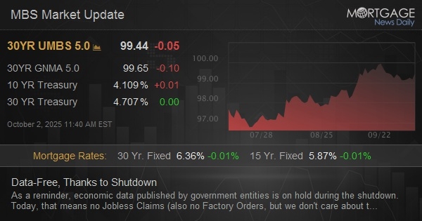 As a reminder, economic data published by government entities is on hold during the shutdown. Today, that means no Jobless Claims (also no Factory Orders, but we don't care about that report anyway), and thus a random walk for trading momentum, absent any unexpected headline shock. Friday still has ISM Services data, and thus some old fashioned "cause and effect" potential.