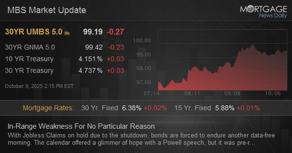 With Jobless Claims on hold due to the shutdown, bonds are forced to endure another data-free morning. The calendar offered a glimmer of hope with a Powell speech, but it was pre-recorded and did not address monetary policy. With that, bonds wait for the day's only real potentially significant event: the 1pm 30yr bond auction. We're seeing a bit of selling this morning, but it is very much an in-range affair so far as is anything with a yield between 4.08 and 4.20.