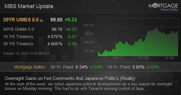 At the start of the week, we noted Japanese political developments as a key reason for overnight losses on Monday morning. This had to do with Takaichi winning control of Japan's LDP party, thus making her the front runner to become the Prime Minister. Her economic views fueled fears that Japan's central bank would ultimately need to sell Treasuries in order to stabilize currency devaluation. Thus, Treasury yields rose. Now today, another party announced an exit from its coalition with the LDP, thus lowering the odds of the fears that were traded on Monday. Bonds logically rallied in response. Later in the overnight session, a series of comments from Fed's Waller (weak employment, not worried about inflation) added to the gains.