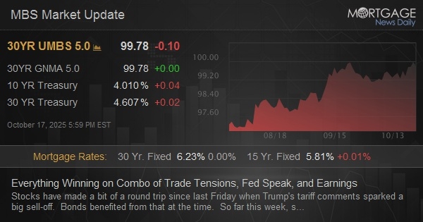 Stocks have made a bit of a round trip since last Friday when Trump's tariff comments sparked a big sell-off. Bonds benefited from that at the time. So far this week, stocks have staged a solid comeback--especially today as upbeat earnings and Fed rate cut expectations provide support. Bonds continue to rally on multiple Fed comments that focus on a weaker labor market underpin an increasingly clear rate cut picture. Many market participants read yesterday's Powell comments as endorsing another cut in October. Bonds mostly had this priced in, but the absence of bad news is good news--at least good enough for more modest gains this morning. That said, gains are tougher to justify from here with yields pushing the lower end of the range boundary.