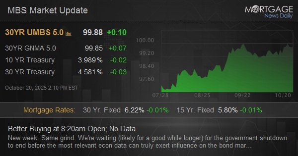 New week. Same grind. We're waiting (likely for a good while longer) for the government shutdown to end before the most relevant econ data can truly exert influence on the bond market in the big picture. On the plus side, the trading in the interim has erred on the bullish side thanks to the available non-gov data and anxiety over trade tensions. So far this morning, bonds have rallied at the 8:20am CME open which is just something that can happen serendipitously due to trader positioning and is not tied to any underlying motivation in news/data.