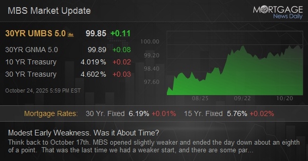 Think back to October 17th. MBS opened slightly weaker and ended the day down about an eighth of a point. That was the last time we had a weaker start, and there are some parallels to today. In both cases, the weakness was modest. In both cases, the previous session closed at the best levels in at least a month. In fact, yesterday's 5.0 MBS prices matched their best close in over a year. We can definitely forgive (and possibly even expect) a small pull-back after such a consistent rally. As discussed in yesterday's video, it was beginning to seem like a good moment for broader consolidation.