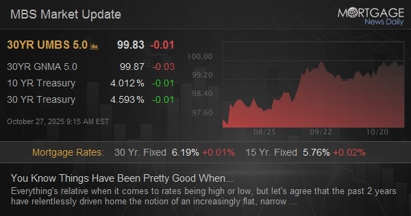 Everything's relative when it comes to rates being high or low, but let's agree that the past 2 years have relentlessly driven home the notion of an increasingly flat, narrow range that has perfectly orbited a 10yr yield around 4.34%. If that's our reality, you know things have been pretty good when 3bps of gradual overnight selling leaves yields under 4.0%. As for underlying reasons, the move was so gradual that we don't necessarily need any better explanation than the consolidation vibes discussed in yesterday's recap. But if you MUST have something to blame, oil prices are up again.