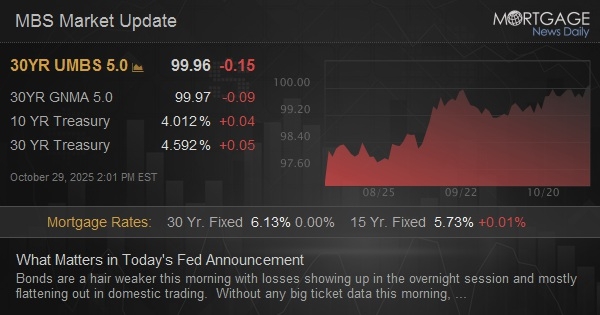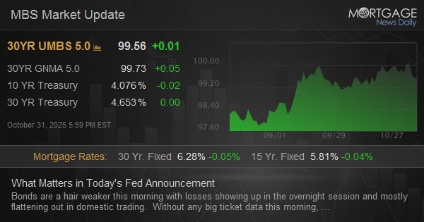 Bonds are a hair weaker this morning with losses showing up in the overnight session and mostly flattening out in domestic trading. Without any big ticket data this morning, this aimless drift is standard operating procedure--especially considering the pre-Fed consolidation was largely assumed to be seen via the modest weakness at the end of last week. That brings us to the Fed this afternoon. Forget the rate cut. That's 100% priced in. Instead, we have two other considerations: Powell's tone at the press conference and the potential inclusion of a change to quantitative tightening in the announcement. Many of our clients have high hopes that an end to QT would be some sort of big victory for bonds, but we'd caution that it's not a game changer. QT is ending soon one way or the other, and the Fed has been clear about that. It's not as if this would constitute QE-levels of bond buying. Bottom line, 2pm or 2:30pm ET could definitely bring some volatility, but nothing that creates big, lasting momentum. For that, we continue to wait for the shutdown to end and for data to return.