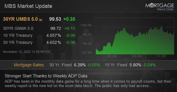 ADP has been in the monthly data game for a long time when it comes to payroll counts, but their weekly report is the new kid on the econ data block. The public has only had access for a few weeks and traders have wasted no time incorporating it into the inner circle of influential market movers. Perhaps this dynamic will fade after the government shutdown ends, but for now, it's big business (as evidenced by the market reaction in TSY futures during the Tuesday holiday). All of the gains on the screen this morning came courtesy of that data and bonds have been broadly flat since then.