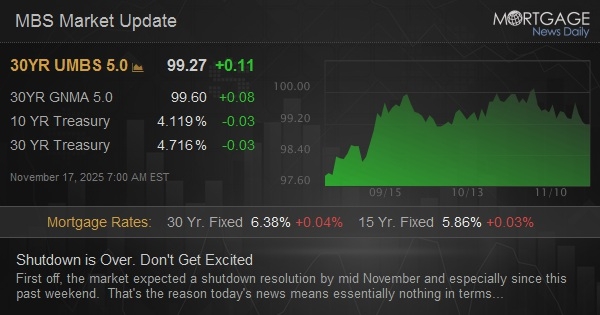 First off, the market expected a shutdown resolution by mid November and especially since this past weekend. That's the reason today's news means essentially nothing in terms of being a surprise headline. On the data front, today is also meaningless in the short term. It's not as if the backlog of econ data will suddenly be released. The only exception is the September jobs report, which could still be released this week since it was largely ready to go before the shutdown. As for the initial reaction in bonds, it's been modestly weaker, as expected, but not weak enough to offset yesterday's gains so far.
