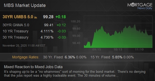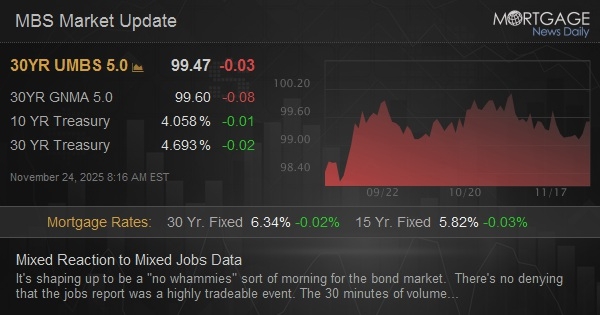 It's shaping up to be a "no whammies" sort of morning for the bond market. There's no denying that the jobs report was a highly tradeable event. The 30 minutes of volume following the release was by far the highest since the October 29th Fed announcement. But that volume has been fairly well balanced between buyers and sellers. Credit the uptick to 4.4% in the unemployment rate for offsetting the job count coming in at 119k vs 50k f'cast. The downward revision to August also isn't hurting (-4k from +22k). Bonds are managing to hold at just slightly stronger levels so far.