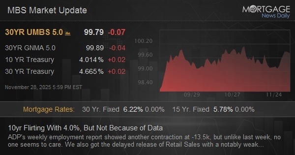 ADP's weekly employment report showed another contraction at -13.5k, but unlike last week, no one seems to care. We also got the delayed release of Retail Sales with a notably weak -0.1 vs 0.3 control group, and backlogged PPI that was just a hair cooler than expected. There too, zero bond market reaction. Thanksgiving week trading vibes are in full effect. Fortunately, the trading that immediately preceded the data was moderately stronger, leaving MBS to start the day up nearly an eighth of a point and 10yr yields down nearly 2bps at 4.011.