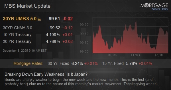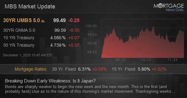 Bonds are sharply weaker to begin the new week and the new month. This is the first (and probably best) clue as to the nature of this morning's market movement. Thanksgiving weeks are prone to random volatility and today's selling basically erases the entirety of last week's movement. Then there's the Bank of Japan's comments on considering rate hikes at the next meeting. Past examples of policy shifts in Japan are burned into the memory of US markets as the source of several large, surprising reactions in bonds. Today's example is getting attention because there's nothing more obvious to blame. And while it could be having an impact for some traders, it's hard to confirm it's the main source of weakness this morning.