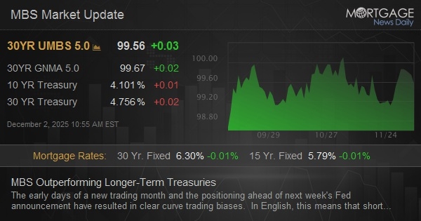 The early days of a new trading month and the positioning ahead of next week's Fed announcement have resulted in clear curve trading biases. In English, this means that shorter-term Treasuries are doing much better than longer-term Treasuries. For example, 2yr yields are down 2.4bps while 10yr yields are up 1.1bps. This dynamic is usually good for MBS because the average implied duration for MBS is closer to 5 years than 10 these days. The result: MBS and 5 year Treasuries are both slightly stronger on the day while 10s are still slightly weaker.