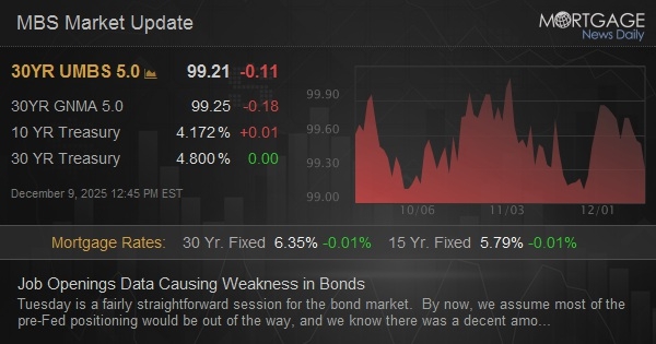 Tuesday is a fairly straightforward session for the bond market. By now, we assume most of the pre-Fed positioning would be out of the way, and we know there was a decent amount of anticipation for the JOLTS data (job openings and labor turnover survey). True to form, volume spiked to its highest levels since the 11/20 delayed release of the jobs report. Unfortunately for bonds, job openings came in higher. The saving grace is that the "quits" rate fell to the lowest levels of the cycle (lower quits = good for rates, all else equal). The net effect is still a sell-off in bonds, but not as forceful a sell-off as it could have been without the mixed signals.