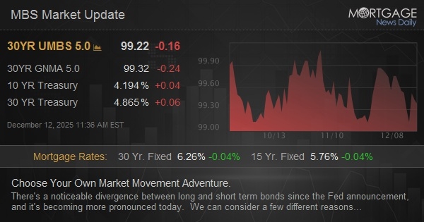 There's a noticeable divergence between long and short term bonds since the Fed announcement, and it's becoming more pronounced today. We can consider a few different reasons with the most basic being that the Fed rate cut outlook keeps shorter-term yields locked down at lower levels thus forcing the long end of the curve to absorb more of the selling impulse on selling days. As far as 2yr yields are concerned, it's not even really a selling day (they're currently DOWN microscopically). Meanwhile, 10yr yields are almost 4bps higher.