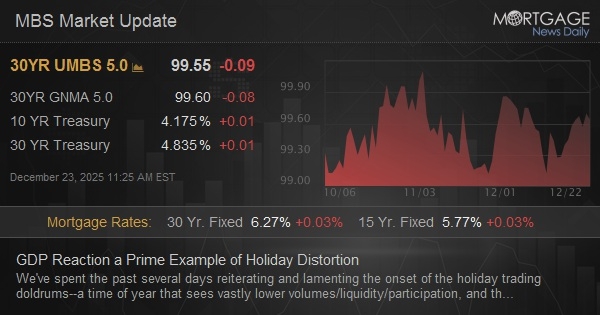 We've spent the past several days reiterating and lamenting the onset of the holiday trading doldrums--a time of year that sees vastly lower volumes/liquidity/participation, and thus runs the risk of volatility that's more random and larger than it otherwise would be. Now this morning, GDP came in much higher than expected and bonds are selling off somewhat sharply. Rather than fly in the face of the holiday trading environment realities, this is actually a prime example. The best evidence for this is the discrepancy between the size of the movement in bonds and the associated volume. Simply put, the movement in bonds is much larger than the reactions to NFP (jobs report) or CPI, but the volume isn't even close to half the size.