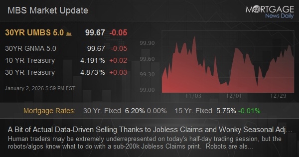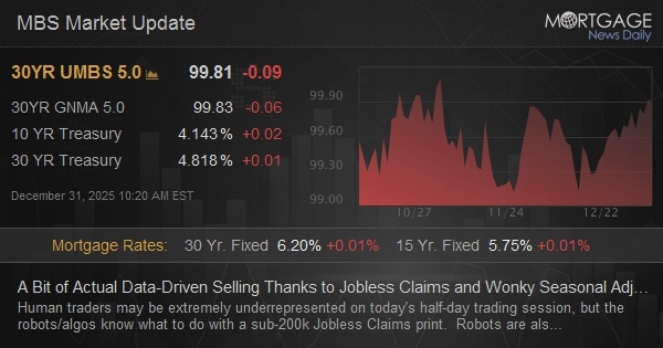 Human traders may be extremely underrepresented on today's half-day trading session, but the robots/algos know what to do with a sub-200k Jobless Claims print. Robots are also not smart enough to know that the sub-200k print is likely distorted by the uncommon occurrence of Christmas falling on a Thursday (last time was 2014). This means seasonal adjustment factors are attuned to more common scenarios where x-mas falls on a Monday. The same issue cropped up after Thanksgiving and claims bounced back in line with the trend the following week. Nonetheless, there's no other input for rates to trade this morning, so we're losing ground.