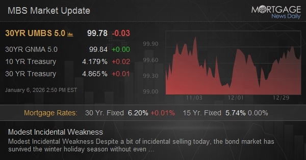 Despite a bit of incidental selling today, the bond market has survived the winter holiday season without even attempting to break outside the narrow prevailing range. This is especially true for shorter duration Treasuries and MBS. It has been and continues to be the case that we won't get a sense of the next wave of momentum until next week at the earliest. It could take even longer if the econ data fails to make a compelling case for better or worse.