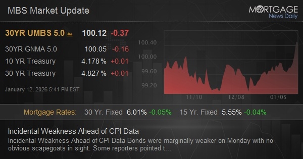 Bonds were marginally weaker on Monday with no obvious scapegoats in sight. Some reporters pointed toward Fed Chair Powell's criminal inquiry as rattling the market, but bonds were effectively unchanged in the 1pm hour after a well-received 10yr Treasury auction. More importantly, there was no clear correlation between the overnight news and the overnight market movement. Volume was the lowest in several days--typical for a data-free Monday. MBS underperformed, but only because they're still range-finding after last week's massive outperformance. Tomorrow morning's trading deserves much more focus than anything seen today. CPI will be out at 8:30am ET and it is expected to be a more tradeable installment of the data compared to the last release (which proved to be questionable due to data collection constraints surrounding the shutdown/reopening timeline).