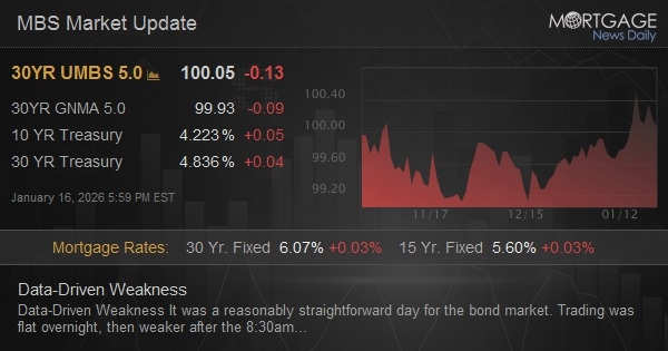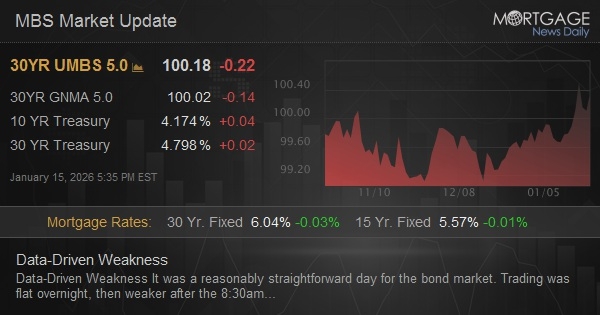It was a reasonably straightforward day for the bond market. Trading was flat overnight, then weaker after the 8:30am Jobless Claims data. That report is hit and miss as a market mover, but a sub-200k print without any recent seasonal spike is certainly worth a few bps of weakness. Impacts were most notable in Fed Funds Rate expectations, which have now fully eliminated any possibility for a January cut and lowered the probability of a March cut from over 40% last week to under 20% today. In the bigger picture, longer-term rates remain squarely range-bound and MBS remain broken out the top of their comparable range thanks to GSE purchases.