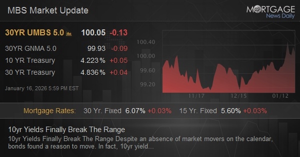 Despite an absence of market movers on the calendar, bonds found a reason to move. In fact, 10yr yields staged their first legit breakout from the narrow trading range of the past 4 months. Whether that has any implications for the future is a debate for technical analysts to have with fundamental traders. There was an extra little jolt of mid-day weakness when Trump suggested Hassett was out of the running for the Fed Chair nomination, but the day's bond losses would still be better-characterized as gradual and non-event-driven. MBS outperformed yet again for the same old reason (actual and/or anticipated GSE MBS purchases), but nonetheless ended the week at the lows.