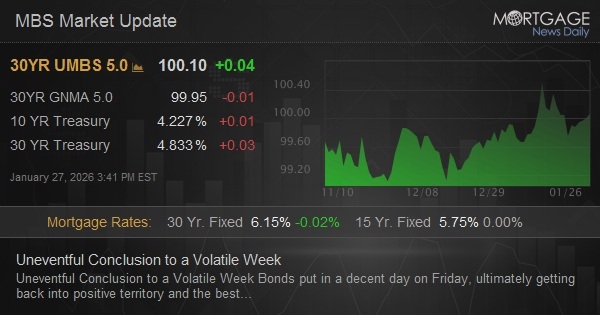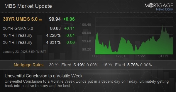 Bonds put in a decent day on Friday, ultimately getting back into positive territory and the best closing levels of the week. Yields were almost perfectly in line with last Friday's. Overall, most of the past 3 days have been uneventful, but Tuesday's range breakout meant it was a volatile week overall. MBS and mortgage rates enjoyed ample insulation against that breakout thanks to recent outperformance driven by GSE MBS purchases (both actual and anticipated). The Fed is on deck next week, but with a zero percent chance of a rate cut. True big ticket data won't return until the week after next.