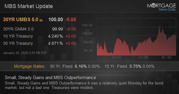 It was a relatively quiet Monday for the bond market, but not a bad one. Treasuries were modestly stronger overnight and MBS opened a few ticks higher. Durable goods data was much stronger than expected, but had no discernible impact. 10yr yields hit their lows of the day at 10:30am and then drifted sideways at just slightly higher (but still positive) levels. MBS, on the other hand, continued making modest gains throughout the day. Part of this had to do with yield curve steepening (i.e. shorter term yields fell more during the day, and MBS align with Treasuries that are a bit shorter than the 10yr note with which they're most frequently compared). But MBS also modestly outperformed even the 5yr Treasury yield--a fact that suggests some GSE bond buying may have contributed to spread tightening.