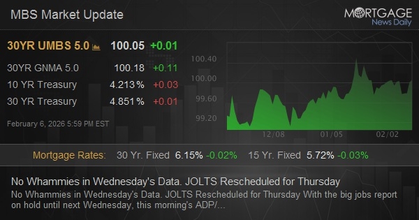 With the big jobs report on hold until next Wednesday, this morning's ADP/ISM duo had to do most of the week's heavy lifting in terms of important econ data. The response was underwhelming, at best. ADP was a complete non-event, but also fairly close to consensus. ISM was mixed and generally helped bonds hold their ground with yields moving down from highs at 10am. The day's range remained inside yesterday's and there were minimal losses by the 3pm close. The JOLTS data that was scheduled for Tuesday will now be coming out on Thursday morning.