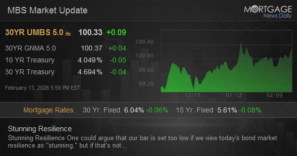 One could argue that our bar is set too low if we view today's bond market resilience as "stunning," but if that's not the right word, it's damn close. Last Thursday saw yields drop 8bps, largely due to a trio of labor market reports that are nowhere near as heavily traded as today's jobs report. Yesterday's Retail Sales helped yields slight significantly below the 4.20% technical barrier. And now today, an effective 0.2% lower unemployment rate (0.1% in the rate itself + 0.1% implied by the higher participation rate) and big beat in the payroll count are worth only a 3bp sell-off to 4.175%? Yep, that's stunning. But why did it happen? That's a question without a great answer today. We'll discuss possibilities in today's recap video.