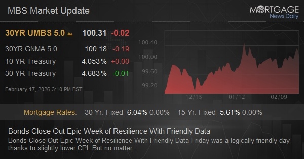 Friday was a logically friendly day thanks to slightly lower CPI. But no matter what happened on any of the other 4 days, this week was all about bonds ending up at much stronger levels in spite of a jobs report that should have sent rates higher on Wednesday. Ironclad justification remains impossible, but the leading theory involves heavy liquidation mode in stocks/commodities on Thursday. Holiday weekend positioning could also be a factor. As such, we'll learn a lot more next Tuesday--especially if stocks find a reason to stage a big bounce.