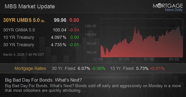 Bonds sold off early and aggressively on Monday in a move that most onlookers are quickly attributing to geopolitics. Specifically, the thought is that higher oil prices imply higher inflation and, thus, higher rates. While some traders probably woke up and decided to sell bonds based on this logic, they didn't account for the pace of the sell-off. Rather, it was a perfect storm of timing and technicals with Friday's month-end positioning leaving bonds overbought and well through the 4% technical floor. Today ran the risk of being a selling day anyway, but the obvious goal of re-entering the 4%+ range made it that much more swift. Closing out at 4.04% doesn't seem too bad in the bigger picture. It's a hard reset in the short term, but not necessarily a sign of additional momentum. For that, this week's econ data would need to gang up and send a bullish message for the economy.
