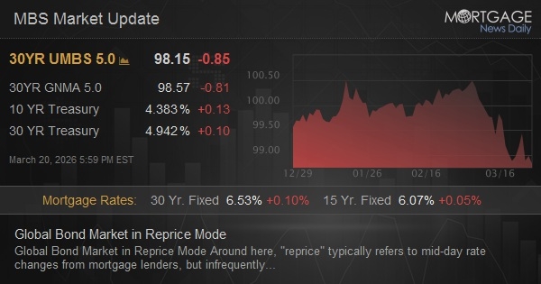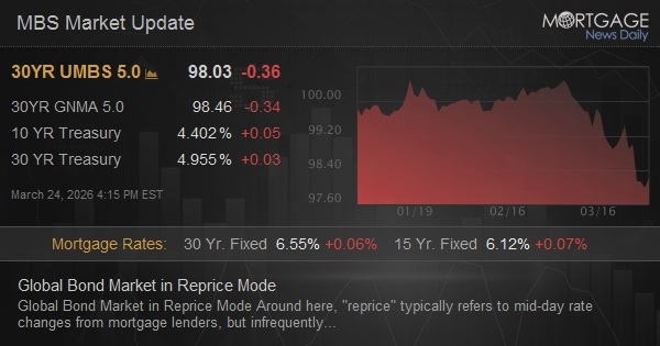 Around here, "reprice" typically refers to mid-day rate changes from mortgage lenders, but infrequently, a big picture repricing occurs in the bond market. That's what's going on in March and especially over the last 2.5 days. Wednesday's Fed comments and Thursday's ECB/BOE comments confirmed that there's a floor under short term rates for a vast majority of the planet's reserve currency holdings, AND that hikes are quickly replacing cuts as the next likely move (September Fed meeting went from 0% hike chance to more than 25% in less than 2 days). Trading and investment strategies of a majority of the world's investible capital was positioned for an entirely different reality before the Iran war. Now it is repositioning... repricing for new realities.