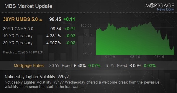 Wednesday offered a welcome break from the pervasive volatility seen since the start of the Iran war. It was among the narrowest trading ranges of any single day in March, especially during domestic trading hours. This is somewhat surprising considering the preponderance of contradictory newswires and headlines concerning the state of the Iran war (i.e. ceasefire vs more strikes and negotiations vs no communication). If Iran is refuting U.S. claims regarding de-escalation, why would bonds be calmly in stronger territory? Simply put: U.S. claims regarding de-escalation matter more than verified agreements with Iran. If the U.S. wants to wind down the war, that's what will happen and that's what the bond market likes.