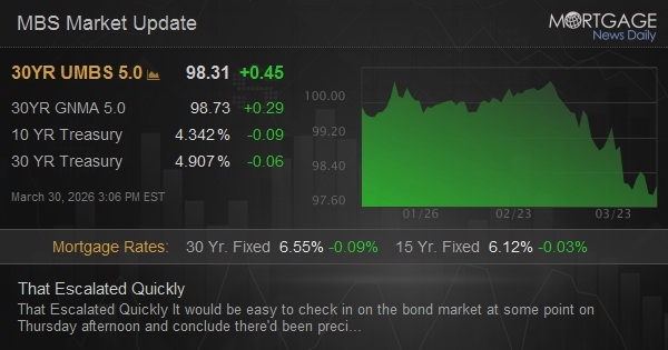 It would be easy to check in on the bond market at some point on Thursday afternoon and conclude there'd been precipitous escalation in the Iran war or some other big new development putting pressure on bonds (10yr yields up almost 10bps to 4.42+ and MBS down more than 5/8ths). But today's selling was remarkably linear and steady. It began in the overnight session and ramped up at 10:30am ET after a brief correction this morning. If you need a single scapegoat, it's simply "renewed escalation" after yesterday's session raised some hopes for the opposite. Looking a bit deeper, we also suspect the entire market is positioning defensively for a weekend with serious volatility potential.